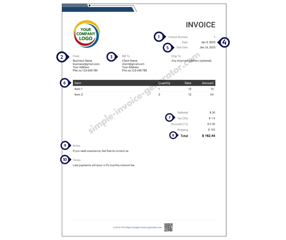 The fundamental details allow your invoice to be specifically linked back to your business and provide straightforward communication channels for any inquiries or concerns.